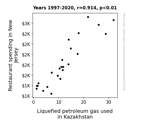 This means 83.5% of the change in the one variable (i.e., Liquefied petroleum gas used in Kazakhstan) is predictable based on the change in the other (i.e., Restaurant spending in New Jersey) over the 24 years from 1997 through 2020.