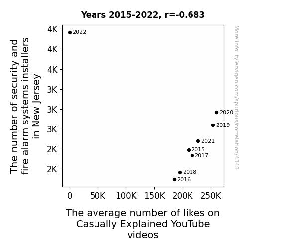 User prompt: Please make up a funny explanation for how an increase in The number of security and fire alarm systems installers in New Jersey caused The average number of likes on Casually Explained YouTube videos to decrease.