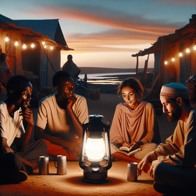 Prompt: Prompt: Generate an image in the style of a meme that shows a group of content creators in Djibouti sitting outside at dusk, collaborating on their next project under the warm glow of kerosene lamps. Capture the flickering light illuminating their faces as they brainstorm and inspire each other for their next YouTube video. The depiction should include only scenes, people, and objects, it should not include text or speech bubbles.