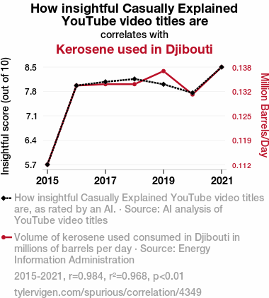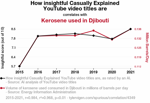 This means 96.8% of the change in the one variable (i.e., Kerosene used in Djibouti) is predictable based on the change in the other (i.e., How insightful Casually Explained YouTube video titles are) over the 7 years from 2015 through 2021.