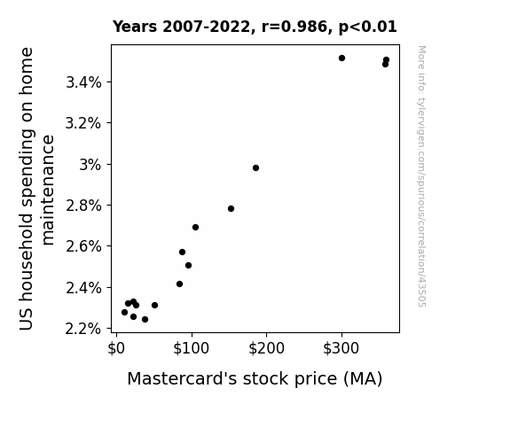 This means 97.1% of the change in the one variable (i.e., Mastercard's stock price (MA)) is predictable based on the change in the other (i.e., US household spending on home maintenance) over the 16 years from 2007 through 2022.