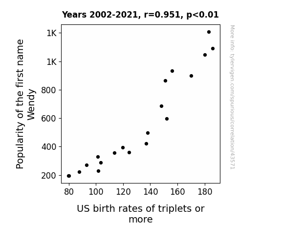 This means 90.4% of the change in the one variable (i.e., US birth rates of triplets or more) is predictable based on the change in the other (i.e., Popularity of the first name Wendy) over the 20 years from 2002 through 2021.