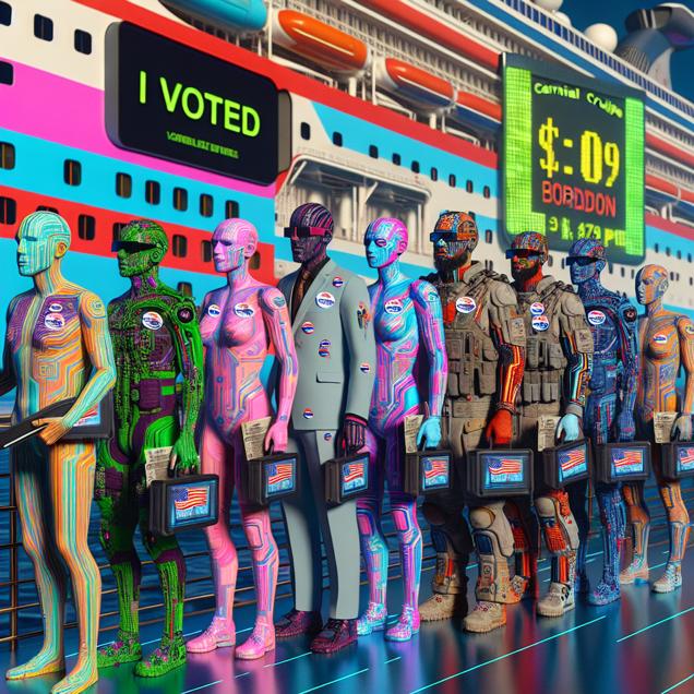 ChatGPT: Generate an image of a group of Cyber folk in various colorful and futuristic attire, all sporting "I Voted" stickers. They stand in an orderly line, waiting to board a vibrant and technologically advanced Carnival cruise ship. The ship's design should be sleek and colorful, with patterns reminiscent of circuit boards and pixelated waves. Each person should be holding a boarding pass, which they hand over to the uniformed crew. In the background, a large digital screen prominently displays the stock ticker for Carnival Corporation (CCL), indicating a slight uptick in price. The scene exudes an atmosphere of excitement and anticipation as the Cyber folk look forward to setting sail and enjoying the amenities and activities on the ship, leaving behind the world of politics as they eagerly discuss the buffet options and relaxation ahead.