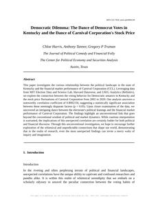 User prompt: Please provide potential search keywords for a paper titled Democratic Dilemma: The Dance of Democrat Votes in Kentucky and the Dance of Carnival Corporation's Stock Price with an abstract of This paper investigates the curious relationship between the political landscape in the state of Kentucky and the financial market performance of Carnival Corporation (CCL). Leveraging data from MIT Election Data and Science Lab, Harvard Dataverse, and LSEG Analytics (Refinitiv), we explore the connection between the voting behavior for Democratic senators in Kentucky and the stock price fluctuations of Carnival Corporation from 2002 to 2020. Our analysis uncovers a noteworthy correlation coefficient of 0.8002156, suggesting a statistically significant association between these seemingly disparate factors (p < 0.05).