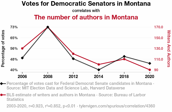 User prompt: Please provide potential search keywords for a paper titled Voting Democ-RATically: A Tail of Two Sensibilities in Montana with an abstract of This paper explores the curious relationship between the number of authors in Montana and the Democratic votes for Senators in the state. Our research team delved into massive datasets from the MIT Election Data and Science Lab, Harvard Dataverse, and the Bureau of Labor Statistics to uncover this puzzling correlation. To our surprise, we uncovered a correlation coefficient of 0.9228635 and a p-value of less than 0.01 for the years 2003 to 2020. Our findings not only raise eyebrows but also provoke a chuckle or two as we consider the interconnectedness of literary pursuits and political leanings in the beautiful state of Montana. We invite fellow academics to join us on this whimsical journey through data analysis and sociopolitical musings.