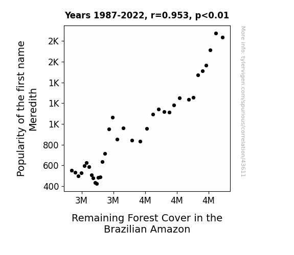 This means 90.7% of the change in the one variable (i.e., Remaining Forest Cover in the Brazilian Amazon) is predictable based on the change in the other (i.e., Popularity of the first name Meredith) over the 36 years from 1987 through 2022.