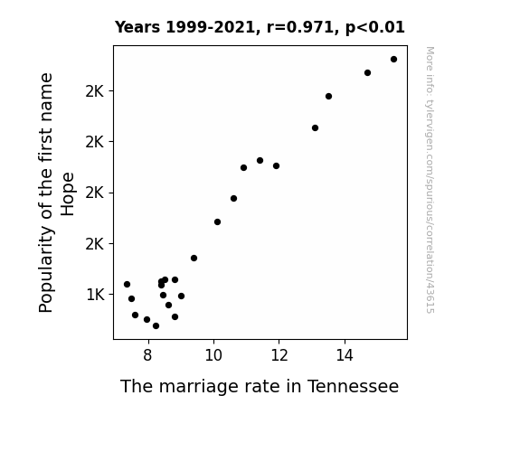 This means 94.3% of the change in the one variable (i.e., The marriage rate in Tennessee) is predictable based on the change in the other (i.e., Popularity of the first name Hope) over the 23 years from 1999 through 2021.