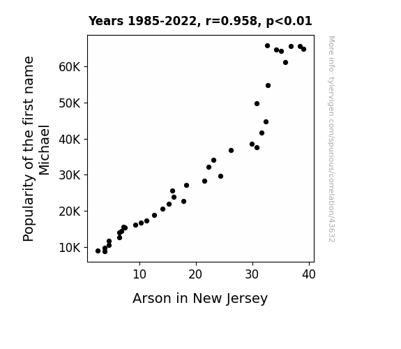 This means 91.9% of the change in the one variable (i.e., Arson in New Jersey) is predictable based on the change in the other (i.e., Popularity of the first name Michael) over the 38 years from 1985 through 2022.