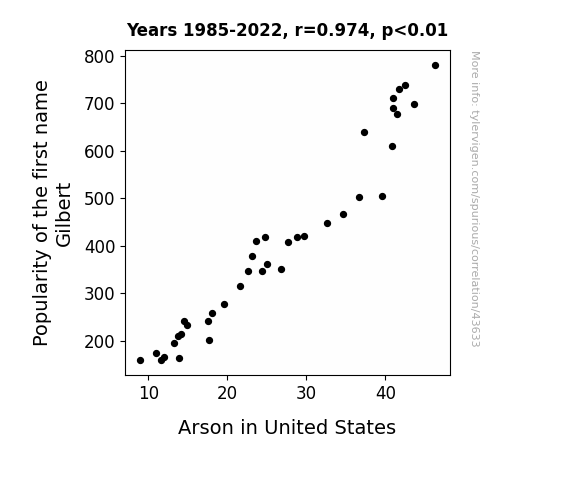 This means 94.8% of the change in the one variable (i.e., Arson in United States) is predictable based on the change in the other (i.e., Popularity of the first name Gilbert) over the 38 years from 1985 through 2022.