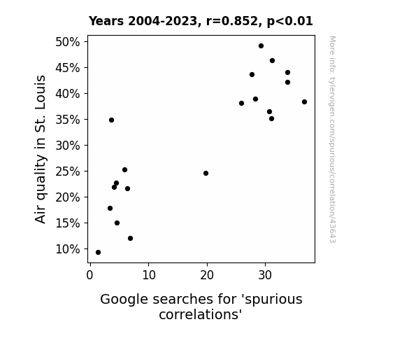 This means 72.7% of the change in the one variable (i.e., Google searches for 'spurious correlations') is predictable based on the change in the other (i.e., Air quality in St. Louis) over the 20 years from 2004 through 2023.