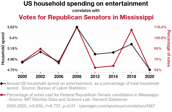 A linear line chart with years as the X-axis and two variables on the Y-axis. The first variable is US household spending on entertainment and the second variable is Votes for Republican Senators in Mississippi.  The chart goes from 2000 to 2020, and the two variables track closely in value over that time. Small Image