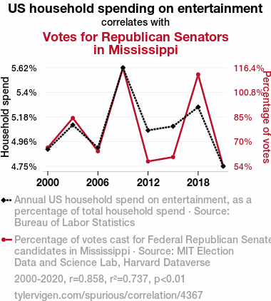 This means 73.7% of the change in the one variable (i.e., Votes for Republican Senators in Mississippi) is predictable based on the change in the other (i.e., US household spending on entertainment) over the 8 years from 2000 through 2020.