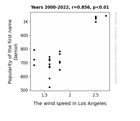 This means 73.3% of the change in the one variable (i.e., The wind speed in Los Angeles) is predictable based on the change in the other (i.e., Popularity of the first name Damon) over the 22 years from 2000 through 2022.