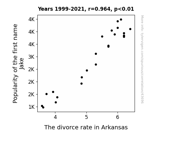 This means 92.9% of the change in the one variable (i.e., The divorce rate in Arkansas) is predictable based on the change in the other (i.e., Popularity of the first name Jake) over the 23 years from 1999 through 2021.