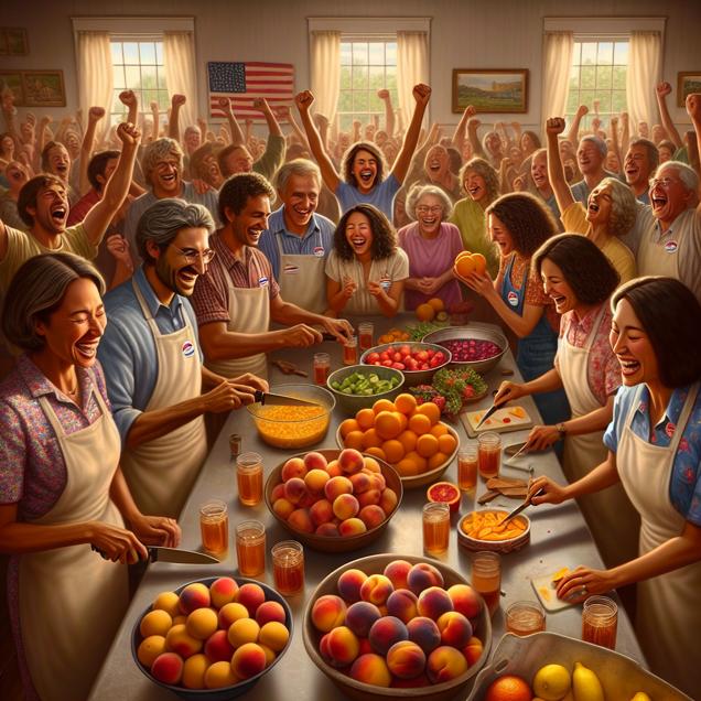 ChatGPT: Generate an image of a warm and inviting kitchen scene with a focus on vibrant fruits being sliced and diced by a happy family in Massachusetts. In the background, depict a group of people proudly wearing Democrat pins as they head to the polling station. The scene should capture the joyful atmosphere, with the sweet aroma of fresh peaches and citrus fruits filling the air, and the anticipation of a successful outcome for the Democratic candidates in the state. Ensure that the details are photorealistic, evoking a sense of happiness and enthusiasm.