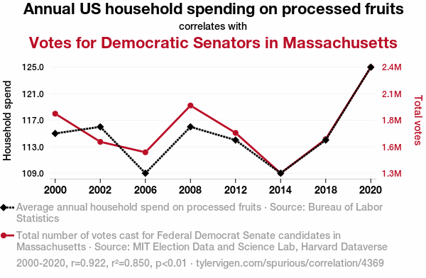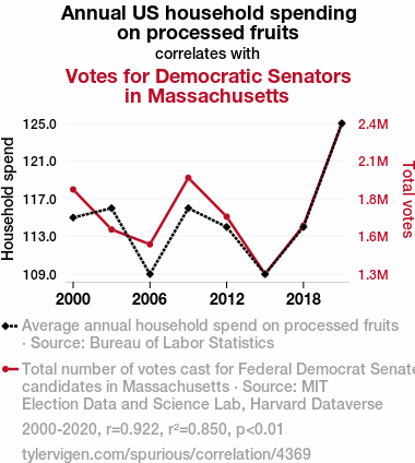 - The spurious research paper: An Apple a Day Keeps the Democrats at Bay: Exploring the Relationship Between Annual US Household Spending on Processed Fruits and Democrat Votes for Senators in Massachusetts