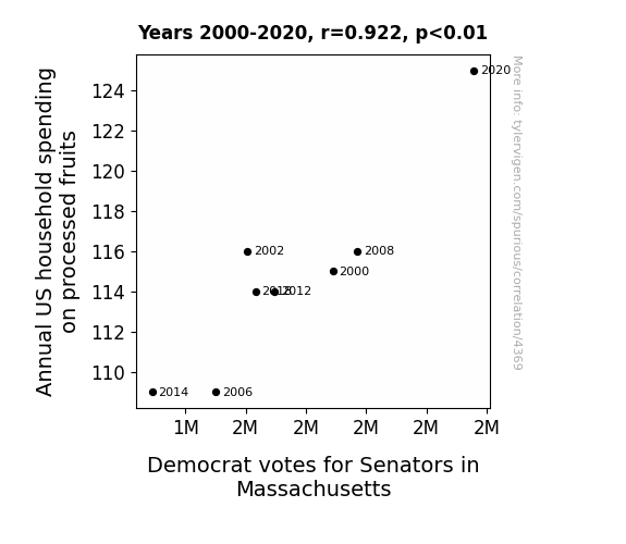 This means 85% of the change in the one variable (i.e., Votes for Democratic Senators in Massachusetts) is predictable based on the change in the other (i.e., Annual US household spending on processed fruits) over the 8 years from 2000 through 2020.