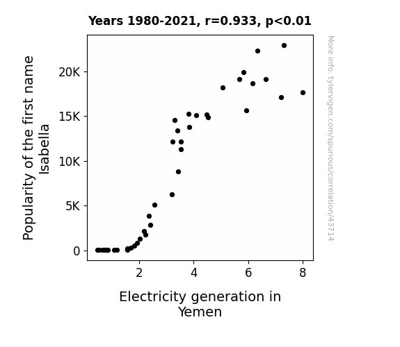This means 87.1% of the change in the one variable (i.e., Electricity generation in Yemen) is predictable based on the change in the other (i.e., Popularity of the first name Isabella) over the 42 years from 1980 through 2021.