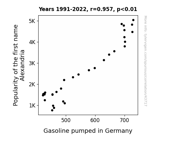 This means 91.6% of the change in the one variable (i.e., Gasoline pumped in Germany) is predictable based on the change in the other (i.e., Popularity of the first name Alexandria) over the 32 years from 1991 through 2022.