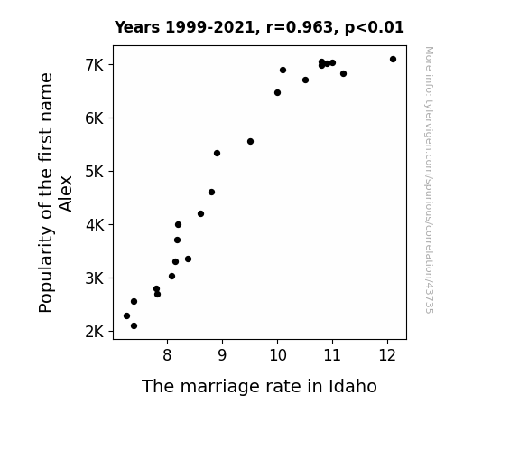 This means 92.8% of the change in the one variable (i.e., The marriage rate in Idaho) is predictable based on the change in the other (i.e., Popularity of the first name Alex) over the 23 years from 1999 through 2021.