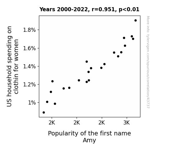 This means 90.4% of the change in the one variable (i.e., Popularity of the first name Amy) is predictable based on the change in the other (i.e., US household spending on clothin for women) over the 23 years from 2000 through 2022.