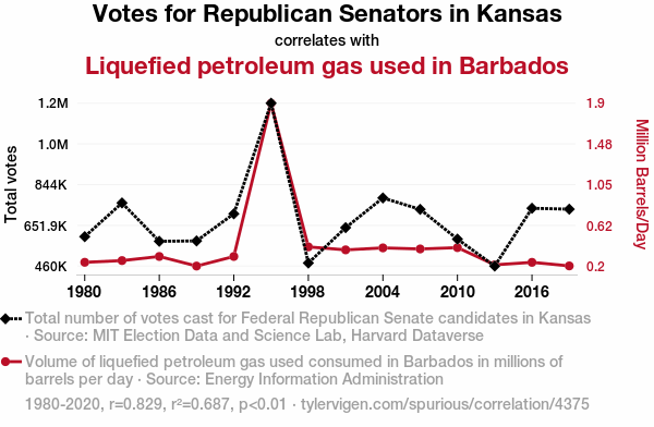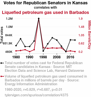 - The spurious research paper: Up in Smoke: The Flaming Hot Link Between Republican Votes in Kansas and LPG Usage in Barbados