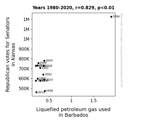 The data analysis revealed a correlation coefficient of 0.8289548, indicating a robust relationship between Republican votes for Senators in Kansas and the usage of liquefied petroleum gas (LPG) in Barbados. This correlation coefficient can be interpreted as a relatively strong positive relationship between the two variables. It's as if these two seemingly unrelated elements have decided to do-si-do in the statistical square dance of life!