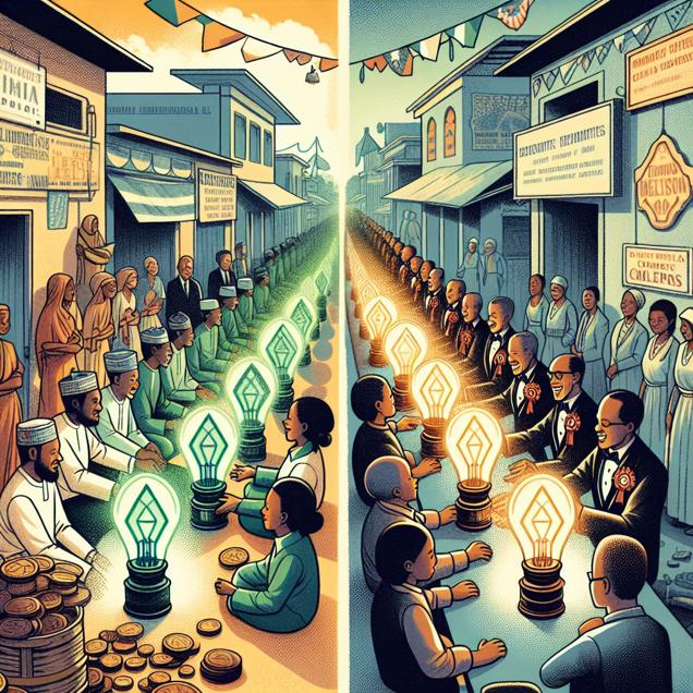 ChatGPT: Generate an image capturing the essence of a vibrant town square in Comoros, where residents are exchanging their traditional kerosene lamps for innovative canisters filled with recycled hot air. The scene should convey a sense of community and progress, with a focus on the bustling activity and the exchange of old and new. Additionally, depict a secondary focus on a group of voters in Arkansas proudly showcasing their "Republican" badges as they line up at polling stations. The image should blend the cultural transition in Comoros with the political engagement in Arkansas, creating a dynamic juxtaposition that encapsulates the diversity of human experiences. Capture the energy and significance of these moments within the town square while ensuring a balanced representation of both settings.