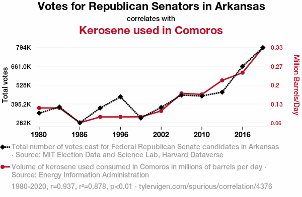 Republican votes Arkansas, kerosene consumption Comoros, political preference correlation energy consumption, MIT Election Data Science Lab, Harvard Dataverse, Energy Information Administration, correlation coefficient, statistical significance, interdisciplinary investigations, data analysis