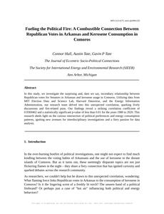 User prompt: Please provide potential search keywords for a paper titled Fueling the Political Fire: A Combustible Connection Between Republican Votes in Arkansas and Kerosene Consumption in Comoros with an abstract of In this study, we investigate the surprising and, dare we say, incendiary relationship between Republican votes for Senators in Arkansas and kerosene usage in Comoros. Utilizing data from MIT Election Data and Science Lab, Harvard Dataverse, and the Energy Information Administration, our research team delved into this unexpected correlation, sparking lively discussions and fire-related puns. Our findings reveal a striking correlation coefficient of 0.9369462 and a statistically significant p-value of less than 0.01 for the years 1980 to 2020. This research sheds light on the curious intersection of political preferences and energy consumption patterns, igniting new avenues for interdisciplinary investigations and a fiery passion for data analysis.