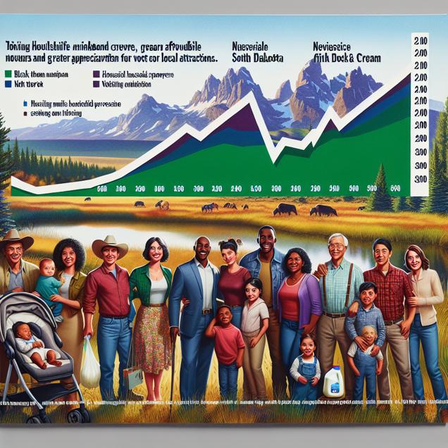 User prompt: Please describe a visual scene that prominently depicts both Annual US household spending on fresh milk and cream and Votes for the Democrat Presidential candidate in South Dakota, in the following situation: As US household spending on fresh milk and cream increased, more families experienced stronger bones, allowing them to travel to South Dakota. These calcium-charged tourists were utterly impressed by the state, leading them to vote for the Democratic Presidential candidate in a cream of the crop campaign. It seems like dairy really does do a body politic good!. Keep the description simple.