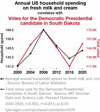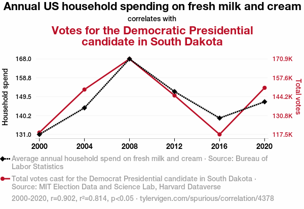 This means 81.4% of the change in the one variable (i.e., Votes for the Democratic Presidential candidate in South Dakota) is predictable based on the change in the other (i.e., Annual US household spending on fresh milk and cream) over the 6 years from 2000 through 2020.