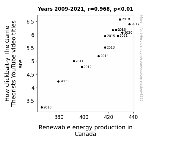 This means 93.7% of the change in the one variable (i.e., Renewable energy production in Canada) is predictable based on the change in the other (i.e., How clickbait-y The Game Theorists YouTube video titles are) over the 13 years from 2009 through 2021.