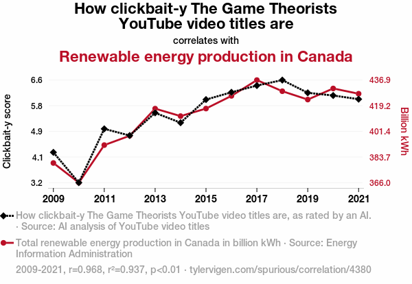 This means 93.7% of the change in the one variable (i.e., Renewable energy production in Canada) is predictable based on the change in the other (i.e., How clickbait-y The Game Theorists YouTube video titles are) over the 13 years from 2009 through 2021.