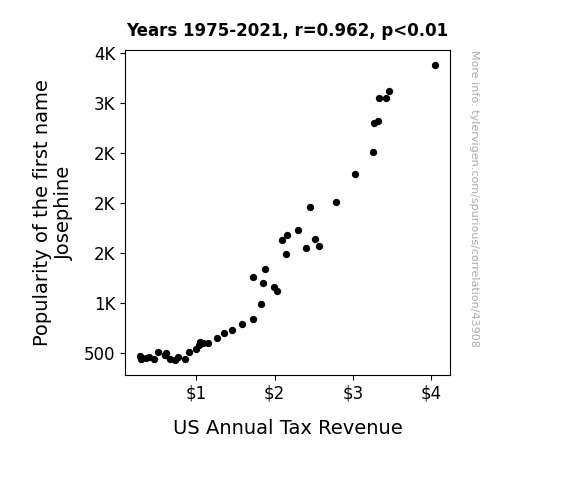 This means 92.5% of the change in the one variable (i.e., US Annual Tax Revenue) is predictable based on the change in the other (i.e., Popularity of the first name Josephine) over the 47 years from 1975 through 2021.