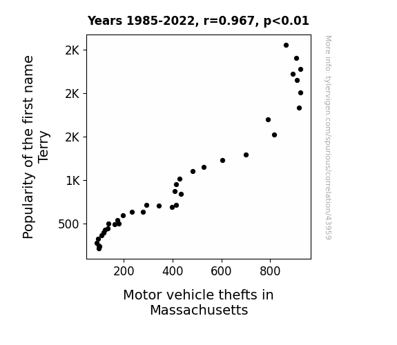 This means 93.6% of the change in the one variable (i.e., Motor vehicle thefts in Massachusetts) is predictable based on the change in the other (i.e., Popularity of the first name Terry) over the 38 years from 1985 through 2022.