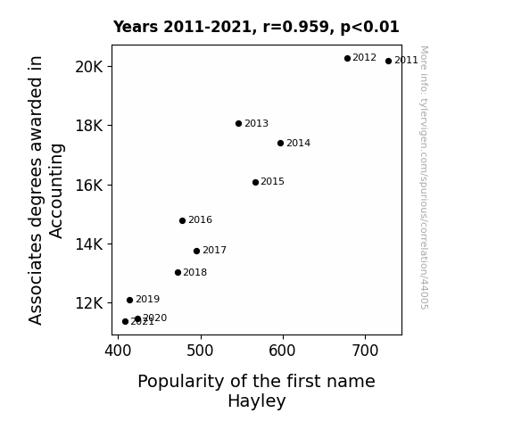 This means 92% of the change in the one variable (i.e., Popularity of the first name Hayley) is predictable based on the change in the other (i.e., Associates degrees awarded in Accounting) over the 11 years from 2011 through 2021.