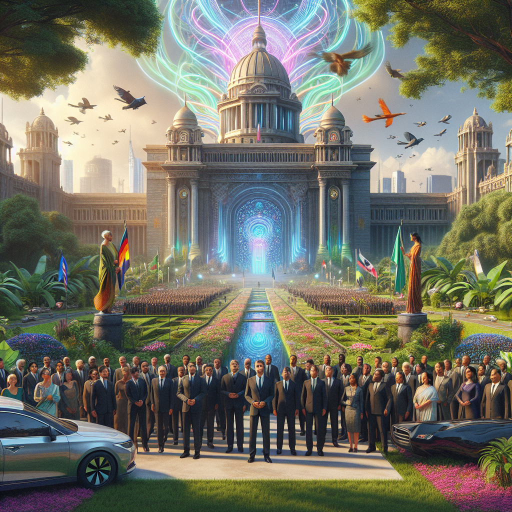 Prompt: Generate a photo-realistic image depicting a scene in Washington, D.C. where government officials are standing in front of a grand governmental building, surrounded by a lush green park. In the background, the air appears crystal clear and free of pollution. Above a fleet of parked cars, recall notices are glowing in a mesmerizing neon hue, capturing the attention of the officials as they gaze upwards with a sense of urgency and realization. The depiction should include only scenes, people, and objects, it should not include text or speech bubbles.