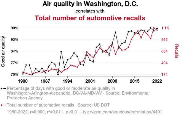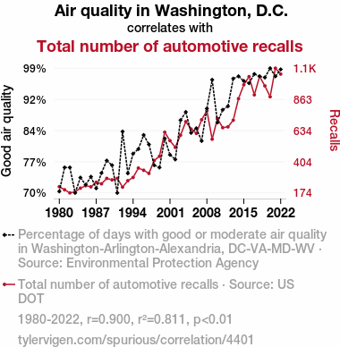 This means 81.1% of the change in the one variable (i.e., Total number of automotive recalls) is predictable based on the change in the other (i.e., Air quality in Washington, D.C.) over the 43 years from 1980 through 2022.