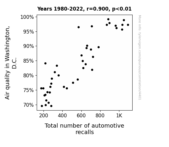The statistical analysis of the relationship between air quality in Washington, D.C. and the total number of automotive recalls yielded compelling results. Over the period of 1980 to 2022, our research team discovered a striking correlation coefficient of 0.9004611, indicating a strong positive association between air quality and automotive recalls. Furthermore, the calculated r-squared value of 0.8108302 suggests that approximately 81% of the variability in the total number of automotive recalls can be explained by variations in air quality. With a p-value of less than 0.01, the statistical significance of this connection is as clear as a windshield after a thorough cleaning.