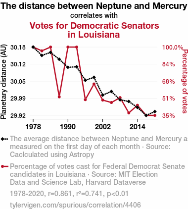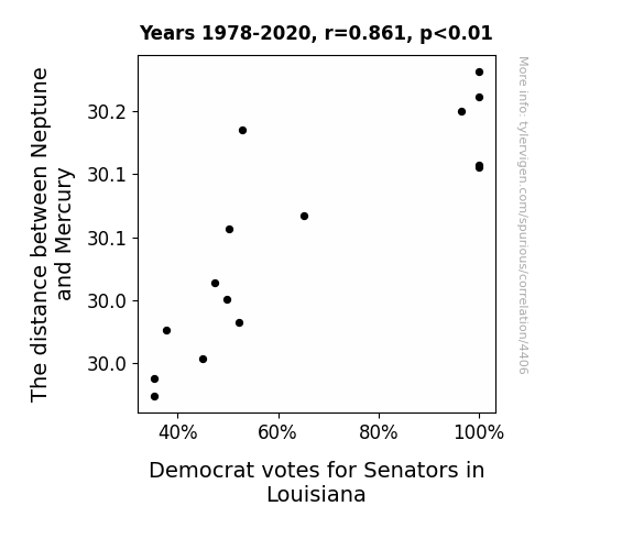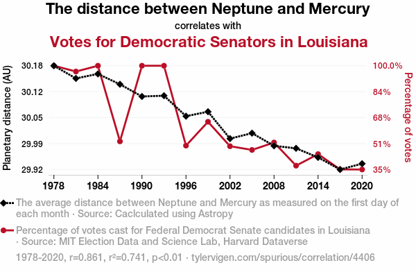 This means 74.1% of the change in the one variable (i.e., Votes for Democratic Senators in Louisiana) is predictable based on the change in the other (i.e., The distance between Neptune and Mercury) over the 15 years from 1978 through 2020.