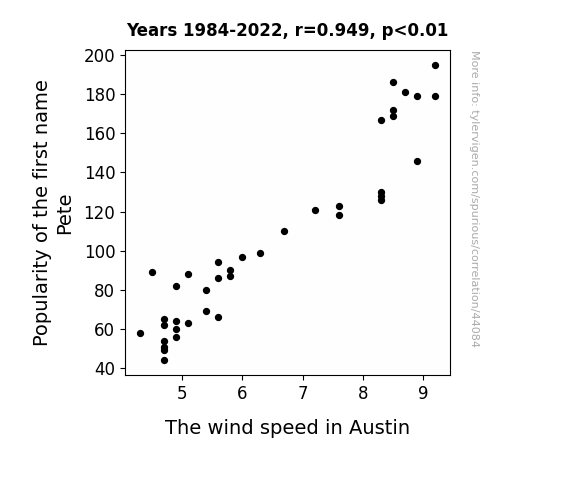 This means 90% of the change in the one variable (i.e., The wind speed in Austin) is predictable based on the change in the other (i.e., Popularity of the first name Pete) over the 39 years from 1984 through 2022.