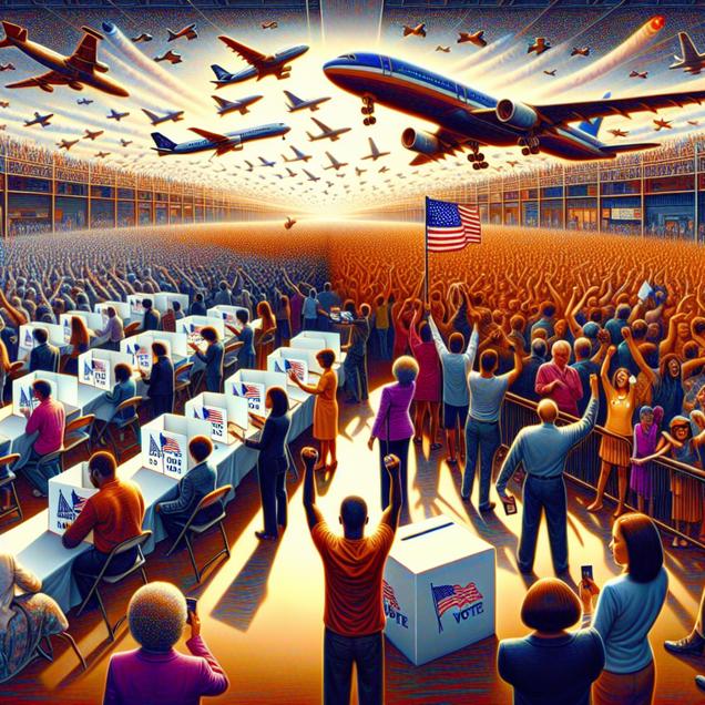User prompt: Please respond with an image generation prompt that would be likely to create an interesting visual using DALLE-3, using the following style: [ Data cyber art ] and depicting this scene: In New Mexico, a large crowd gathers at a polling station, with many people casting their Votes for the Republican Presidential candidate. The excitement in the air is palpable as the support for the candidate spreads like an energetic wave. Meanwhile, in Albania, airplanes take off and land constantly, with the demand for Jet fuel surging. The skies over Albania seem to be ablaze with activity, all sparked by the political fervor in New Mexico. Keep the visual depiction simple. Do not include any words or speech bubbles.
