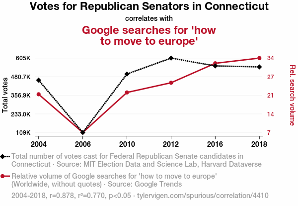 - The spurious research paper: Navigating Ideological Tides: A Correlational Analysis of Republican Votes for Senators in Connecticut and Google Searches for 'How to Move to Europe'
