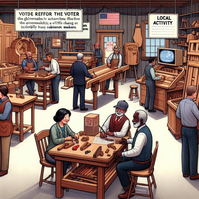 User prompt: Please respond with an image generation prompt that would be likely to create an interesting visual using DALLE-3, using the following style: [ Concept art ] and depicting this scene: In a cozy woodworking shop in Oklahoma, we see a group of Democratic voters discussing the latest Senate election results. As the number of Democrat votes for Senators in Oklahoma decreases, we observe a decrease in the number of political cabinet reshufflings on a nearby television screen. This decrease in political activity subsequently influences the demand for new cabinets, causing a decline in the number of busy cabinetmakers working diligently in the shop. The connection between politics and woodworking becomes clear in this local scene. Keep the visual depiction simple. Do not include any words or speech bubbles.