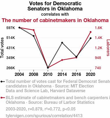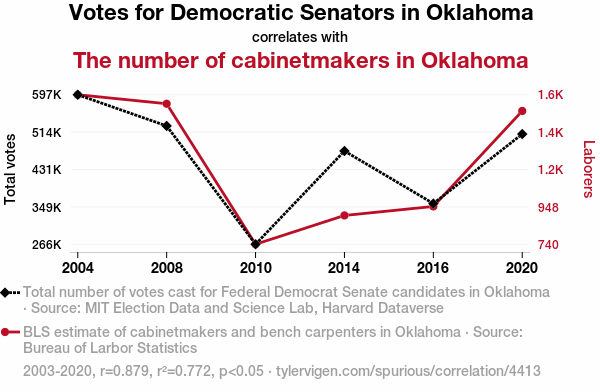 This means 77.2% of the change in the one variable (i.e., The number of cabinetmakers in Oklahoma) is predictable based on the change in the other (i.e., Votes for Democratic Senators in Oklahoma) over the 6 years from 2003 through 2020.