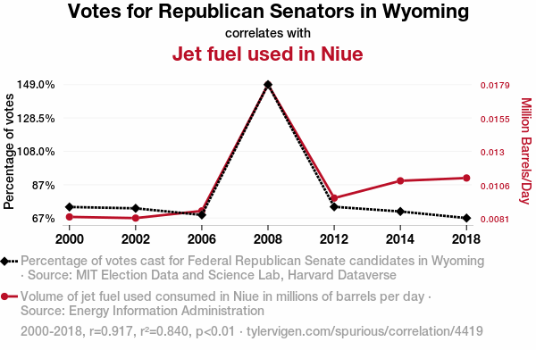 User prompt: Please provide potential search keywords for a paper titled The WY of Republican Votes: The Jet Fuel Niue-nce with an abstract of This study examines the curious relationship between Republican votes for Senators in Wyoming and the jet fuel used in Niue, uncovering a significant correlation between the two seemingly unrelated factors. Leveraging data from the MIT Election Data and Science Lab, Harvard Dataverse, and the Energy Information Administration, our research team compiled and analyzed data from 2000 to 2018 to probe this quirky conundrum.