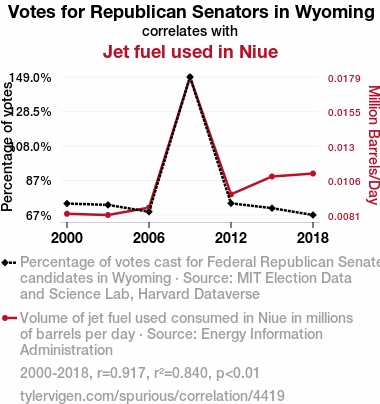This means 84% of the change in the one variable (i.e., Jet fuel used in Niue) is predictable based on the change in the other (i.e., Votes for Republican Senators in Wyoming) over the 7 years from 2000 through 2018.