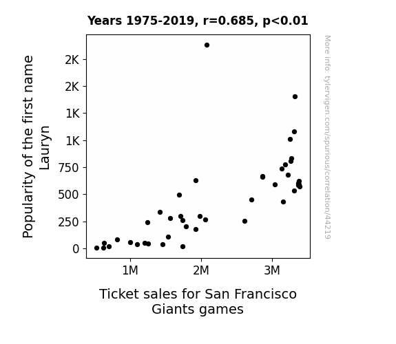 This means 47% of the change in the one variable (i.e., Ticket sales for San Francisco Giants games) is predictable based on the change in the other (i.e., Popularity of the first name Lauryn) over the 45 years from 1975 through 2019.