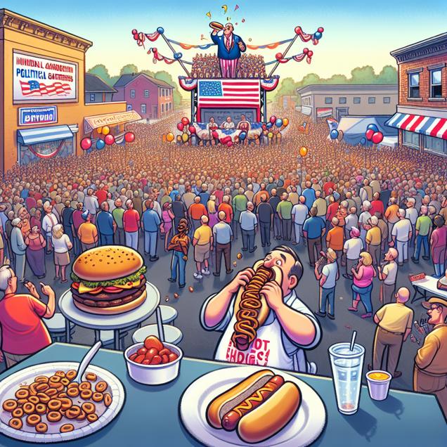 User prompt: Please describe a visual scene that prominently depicts both Votes for the Democrat Presidential candidate in Illinois and Hotdogs consumed by Nathan's Hot Dog Eating Competition Champion, in the following situation: The democratic candidate's success led to a surge in political barbecue fundraisers. This created a high demand for hotdogs, inadvertently boosting the morale of the Nathan's Hot Dog Eating Competition Champion. As the democratic votes rolled in, so did the extra buns for the hotdog champ, proving that in the world of competitive eating, it's all about relishing the opportunity.. Keep the description simple.